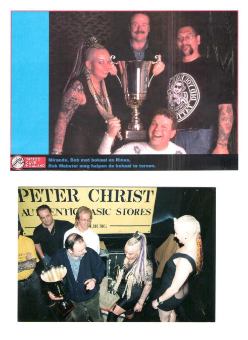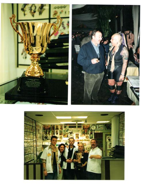 Een beker voor zijn lange loopbaan uitgereikt door Rinus van Fine Line Tattoo uit Middelburg (ooit een klant van Bob) & piercing Miranda.