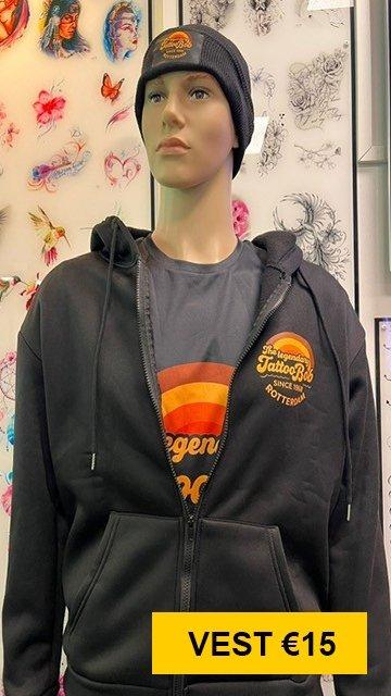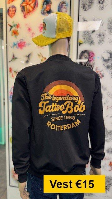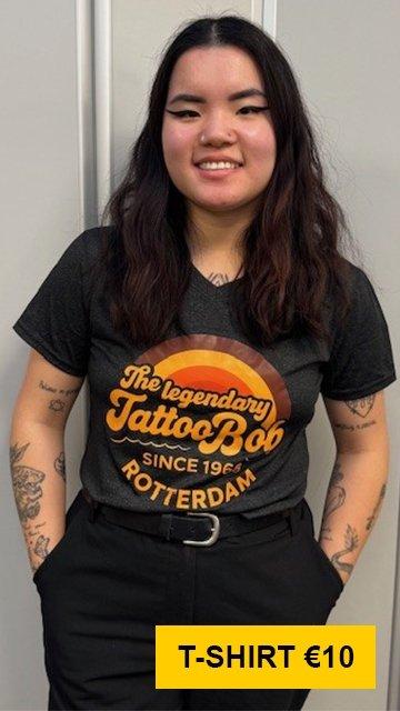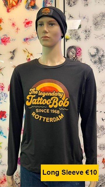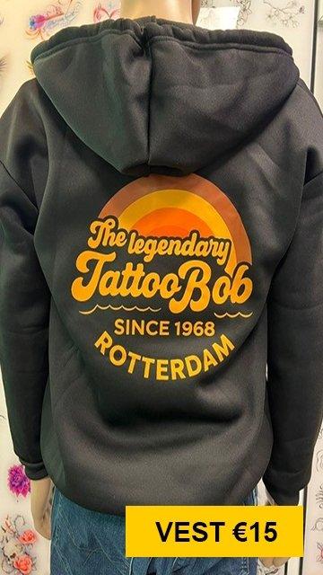 Het nieuwe Tattoo Bob merchandise-logo is een regelrecht succes en trekt meteen de aandacht. Met een rauwe, authentieke 70’s tattoo look brengt het die echte old-school vibe terug, precies zoals je ’m wilt. In combinatie met de verrassend scherpe prijzen is deze merch niet alleen stijlvol, maar ook onweerstaanbaar. Dit is merchandise die je móét hebben.