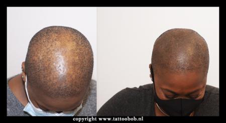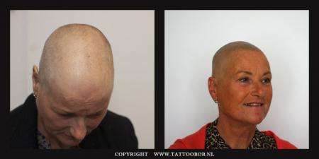 Micro haar pigmentatie vrouwen | Bij vrouwen is MHP exact hetzelfde als bij mannen. Er is een klein verschil te vinden in sommige gevallen. Het verschil zit 'm soms in het opvullen van de kale plekjes op de hoofdhuid. Dit komt voor bij de kruin of zijkant van het hoofd. We camoufleren ook wel tussen de steeds dunner wordende haren door. Over het algemeen camoufleren wij de plekjes wat meer.. De techniek die voor vrouwen wordt gebruikt als zij geen andere mogelijkheid hebben dan stoppels te tatoeeeren heeft iets weg van de hairstroke techniek welke wij gebruiken voor het plaatsen van permanente wenkbrauwen.