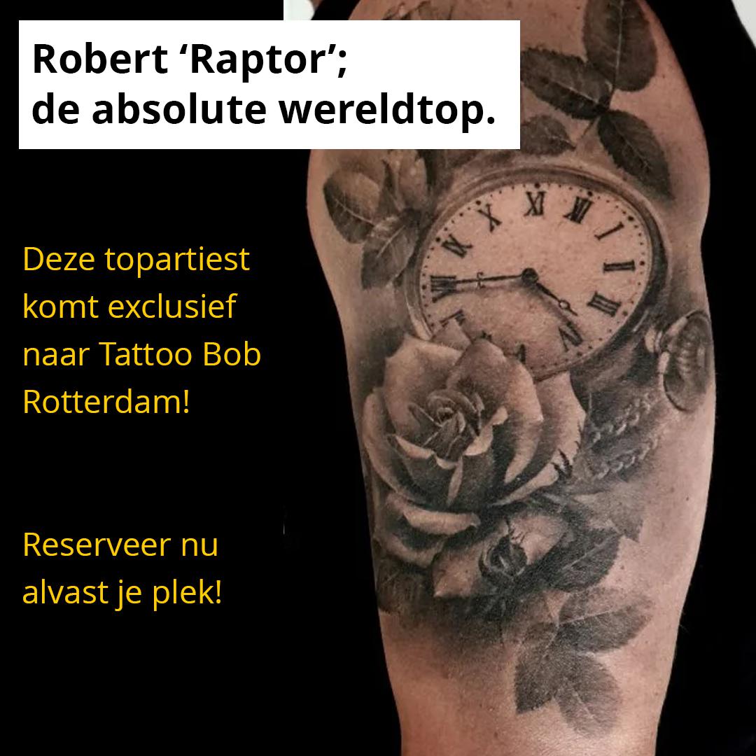 De nieuwste aanwinst bij Tattoo Bob: Robert, ook wel bekend als "Raptor". Een begrijpelijke bijnaam; het is een killer van een tattoo artist! Deze wereldberoemde tattoo artiest is de komende drie maanden in Nederland en is daarvoor neergestreken bij de bekendste tattooshop van Nederland sinds 1968. Een logische samenwerking, wat ons betreft!